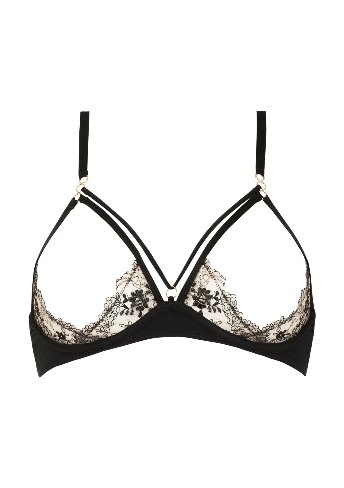 De Apres Minuit Black Open Bra is een open beha met beugel die de borst op een subtiele en erotische manier accentueert. De zwarte florale borduursels op een nude basis creëren een elegant contrast, terwijl de fijne gouden draden en accessoires zorgen voor een verfijnde glans.