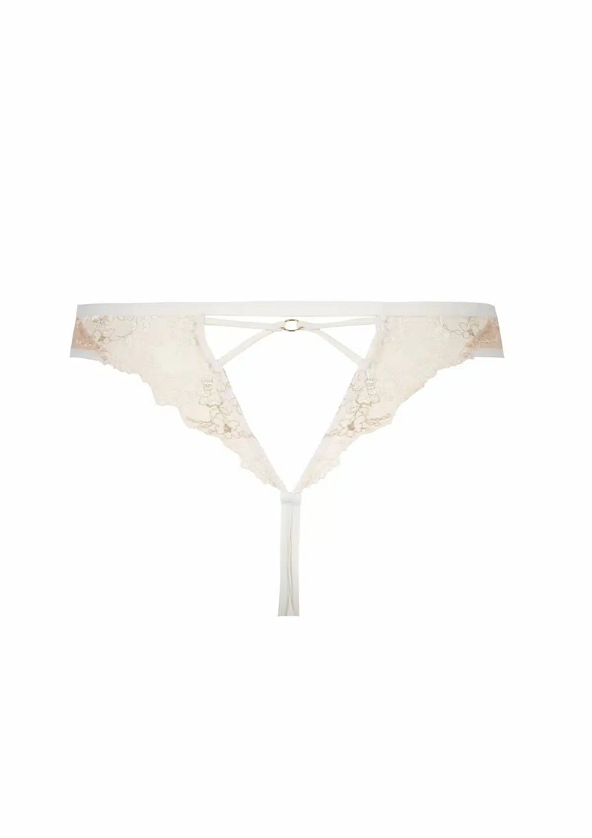 Aan de achterzijde volgt het borduurwerk de natuurlijke rondingen van het lichaam dankzij slimme uitsnijdingen, wat zorgt voor een flatterende en sensuele pasvorm. Open details, fijne elastische bandjes en gouden ringaccenten zijn strategisch geplaatst en versterken het grafische karakter van het ontwerp.