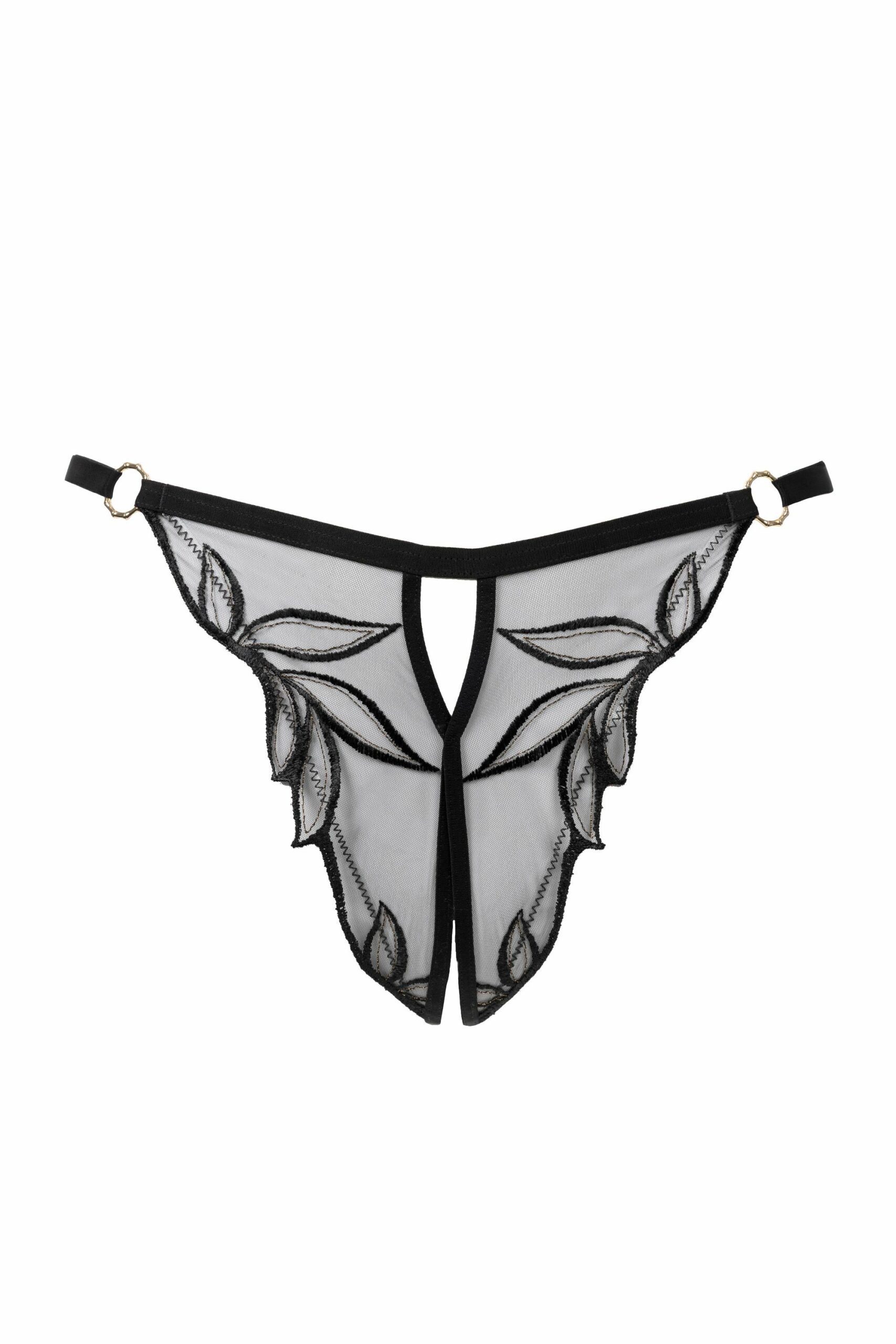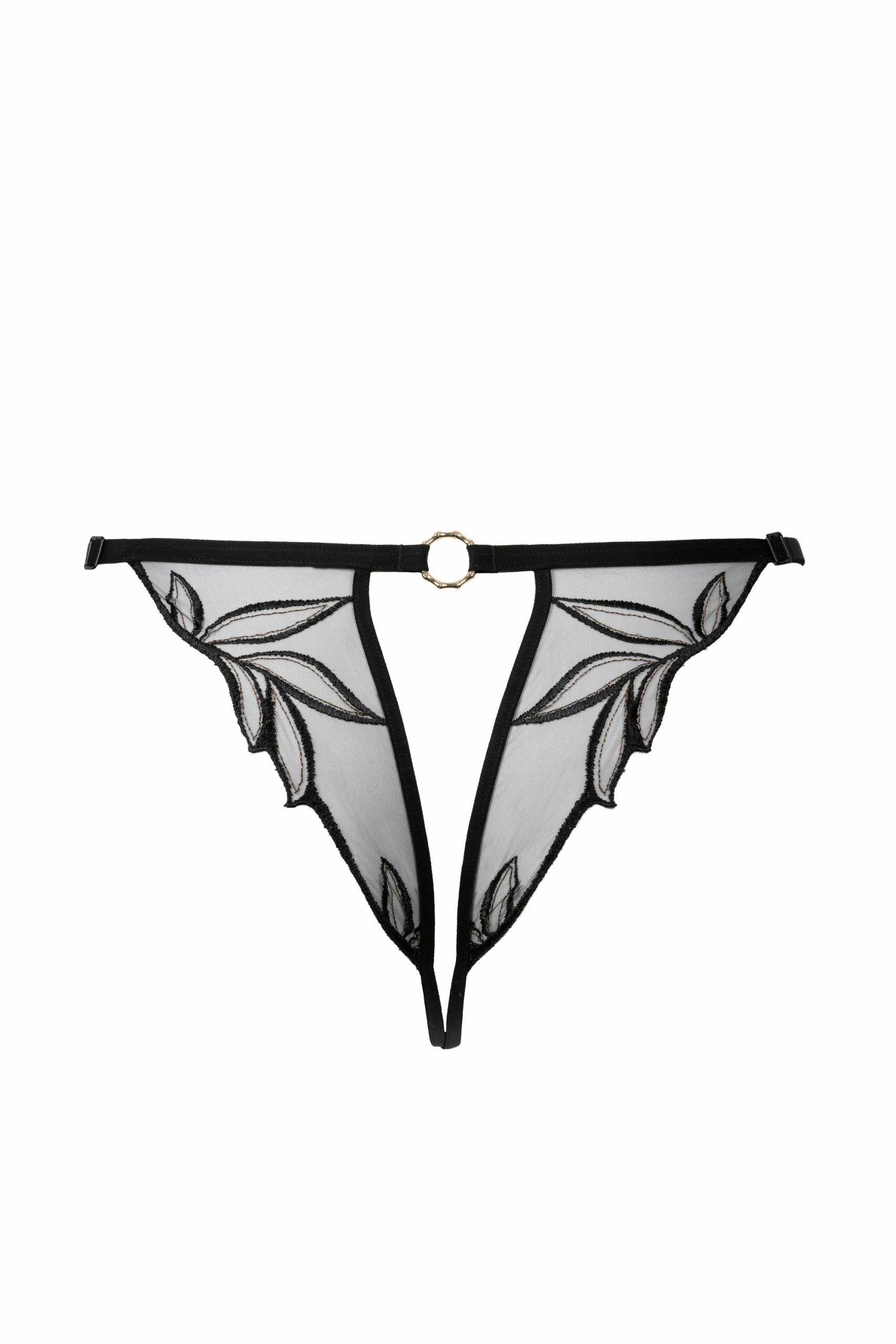 De string is uitgevoerd in zacht, transparant tule dat de huid subtiel zichtbaar maakt, terwijl het grafische botanische borduurwerk de natuurlijke rondingen elegant omlijst.