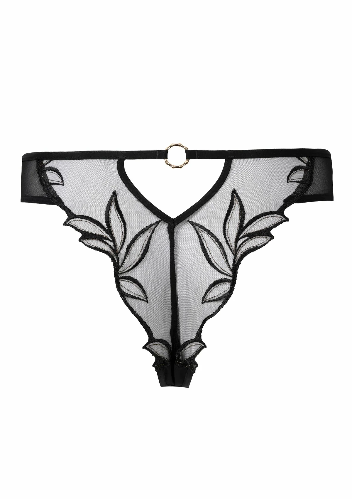 Het zachte, transparante zwarte tule legt de nadruk op de natuurlijke rondingen, terwijl grafisch botanisch borduurwerk de heupen en onderrug elegant omlijst. De plaatsing van het borduurwerk versterkt het silhouet en geeft de tanga een luchtige, moderne allure.
