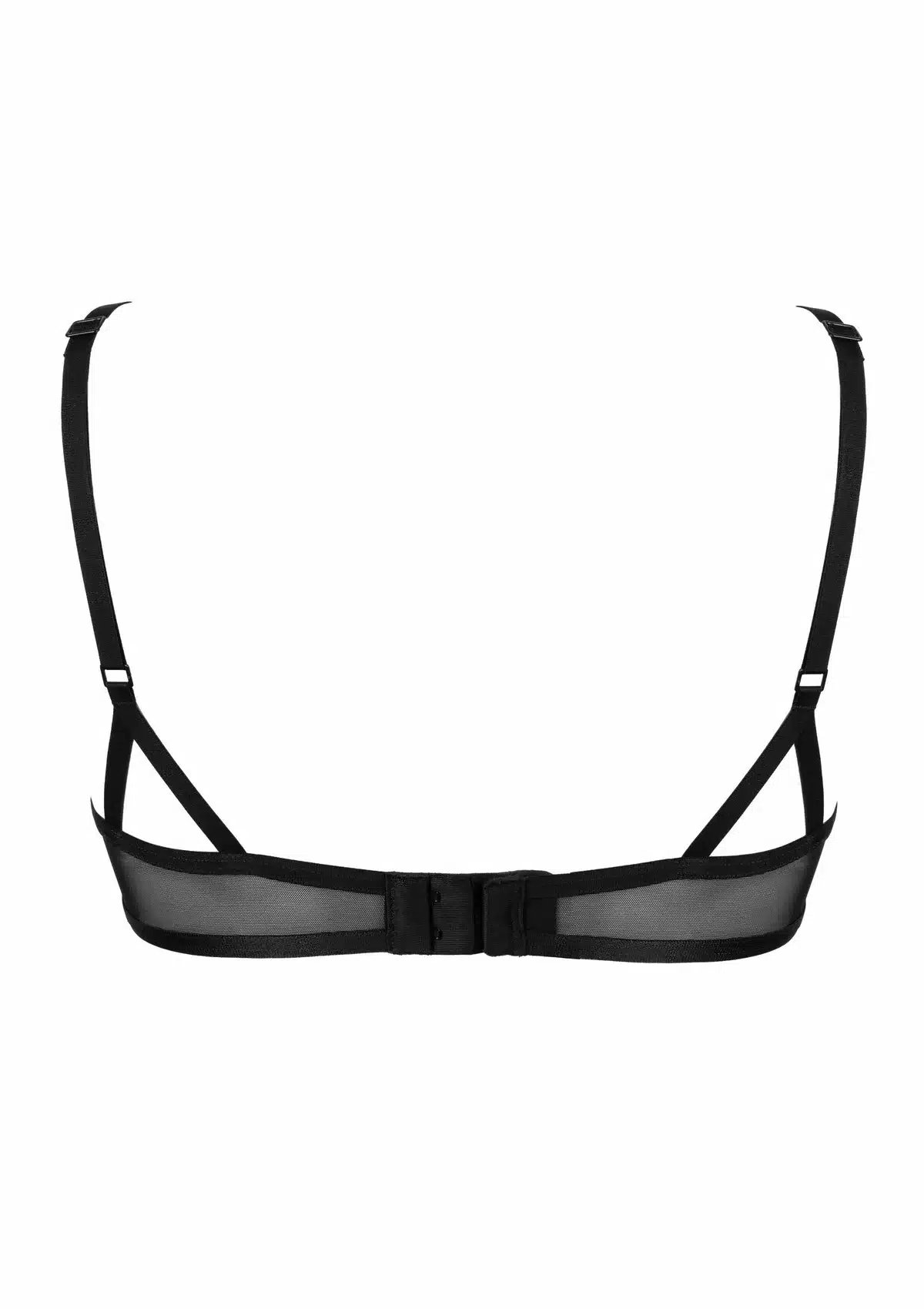 Het transparante tule onthult het decolleté op een subtiele manier, terwijl het grafische botanische borduurwerk de rondingen van de borst sierlijk omlijst. Het resultaat is een zachte, vrouwelijke uitstraling die tegelijk sensueel en verfijnd is.