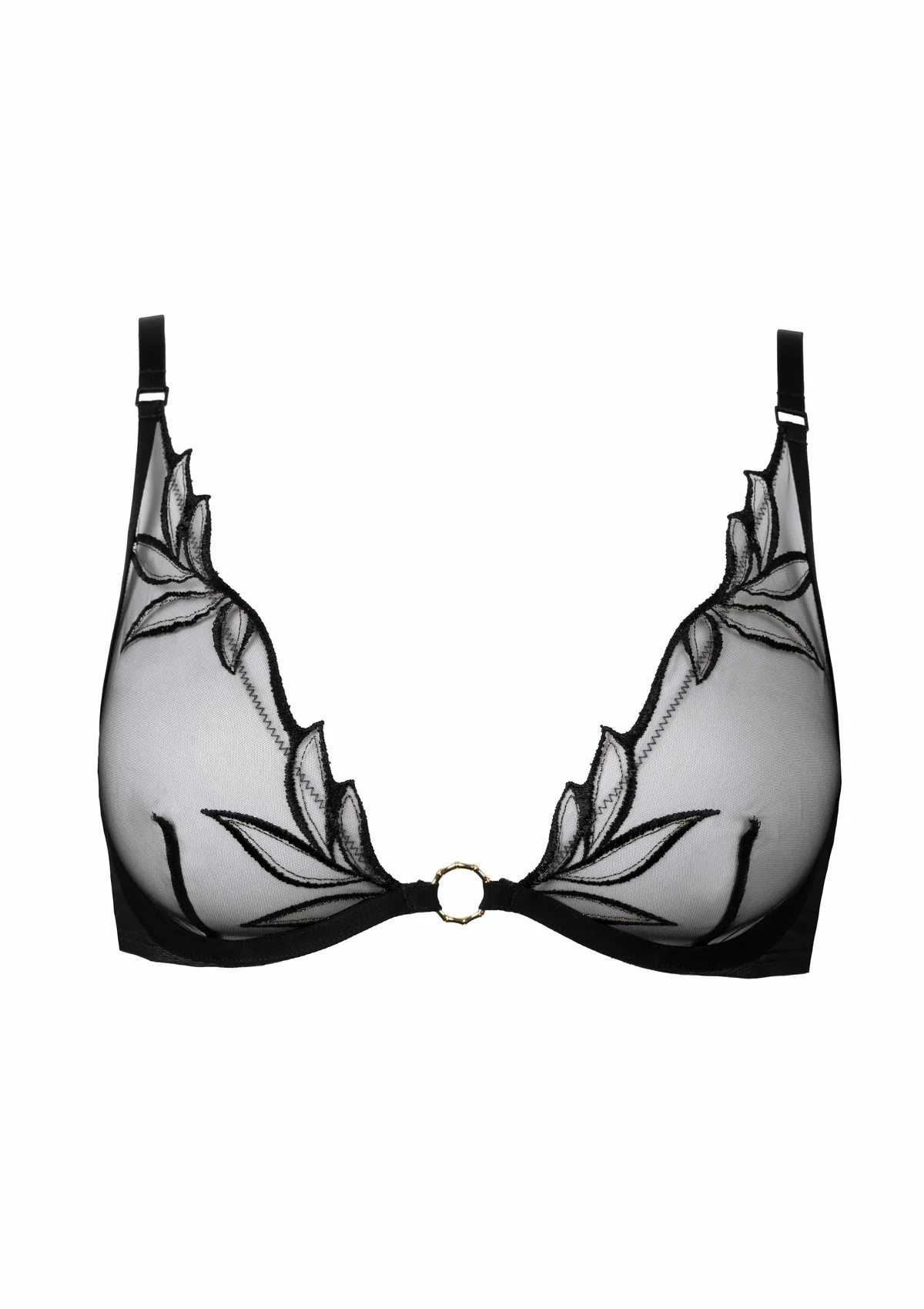 Het transparante tule speelt met licht en schaduw, terwijl botanisch borduurwerk het decolleté elegant omlijst en de natuurlijke vormen van de borst benadrukt. Het lichte beugeldraad biedt zachte, discrete steun zonder in te boeten aan comfort of elegantie.