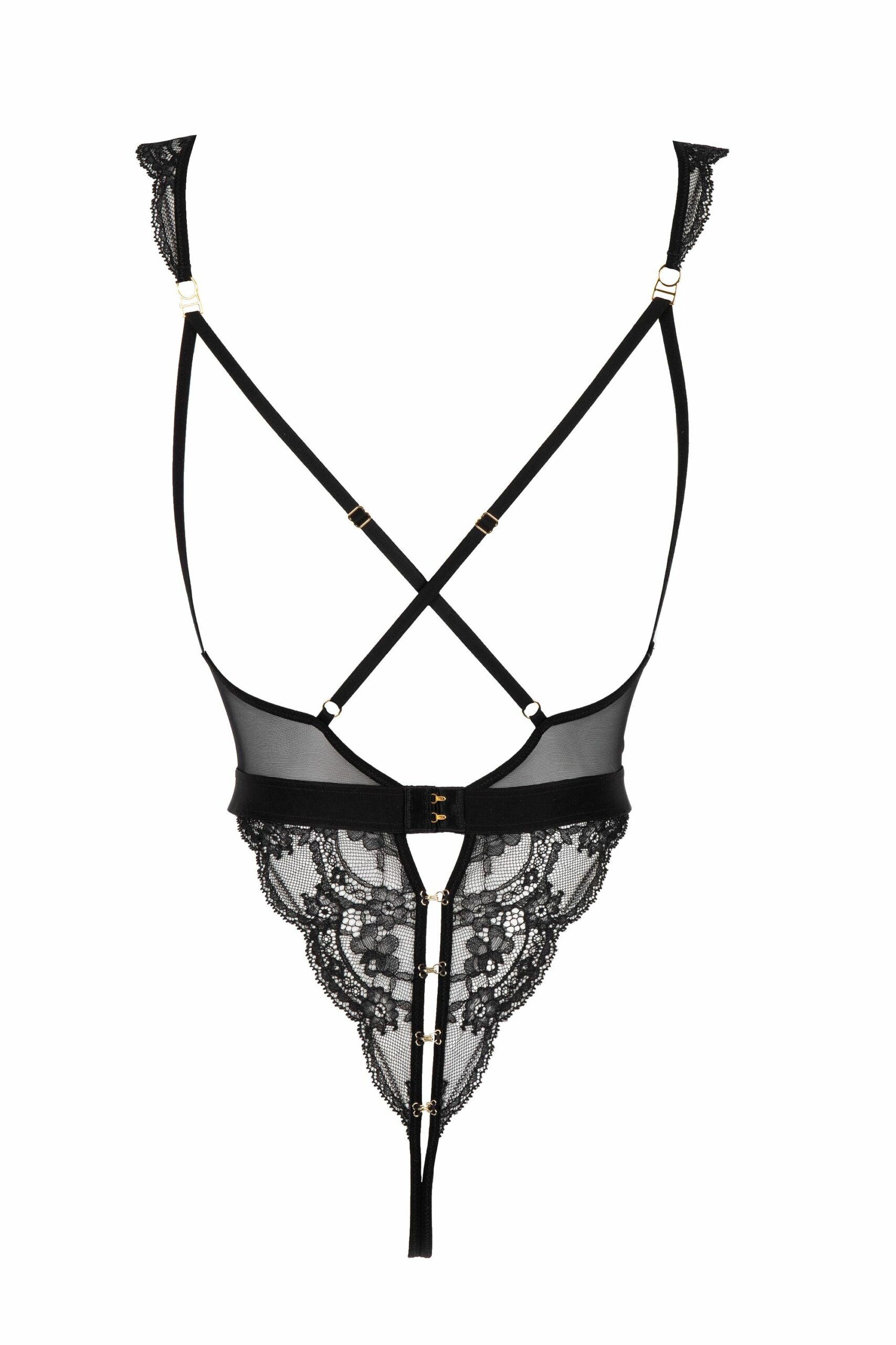 Deze body is volledig uitgevoerd in verfijnde kant en heeft een diep uitgesneden decolleté dat de buste krachtig en verleidelijk omlijst. De opening van boven tot onder met kleine goudkleurige haakjes creëert niet alleen een visueel statement, maar voegt ook een speels, luxueus element toe aan het ontwerp.