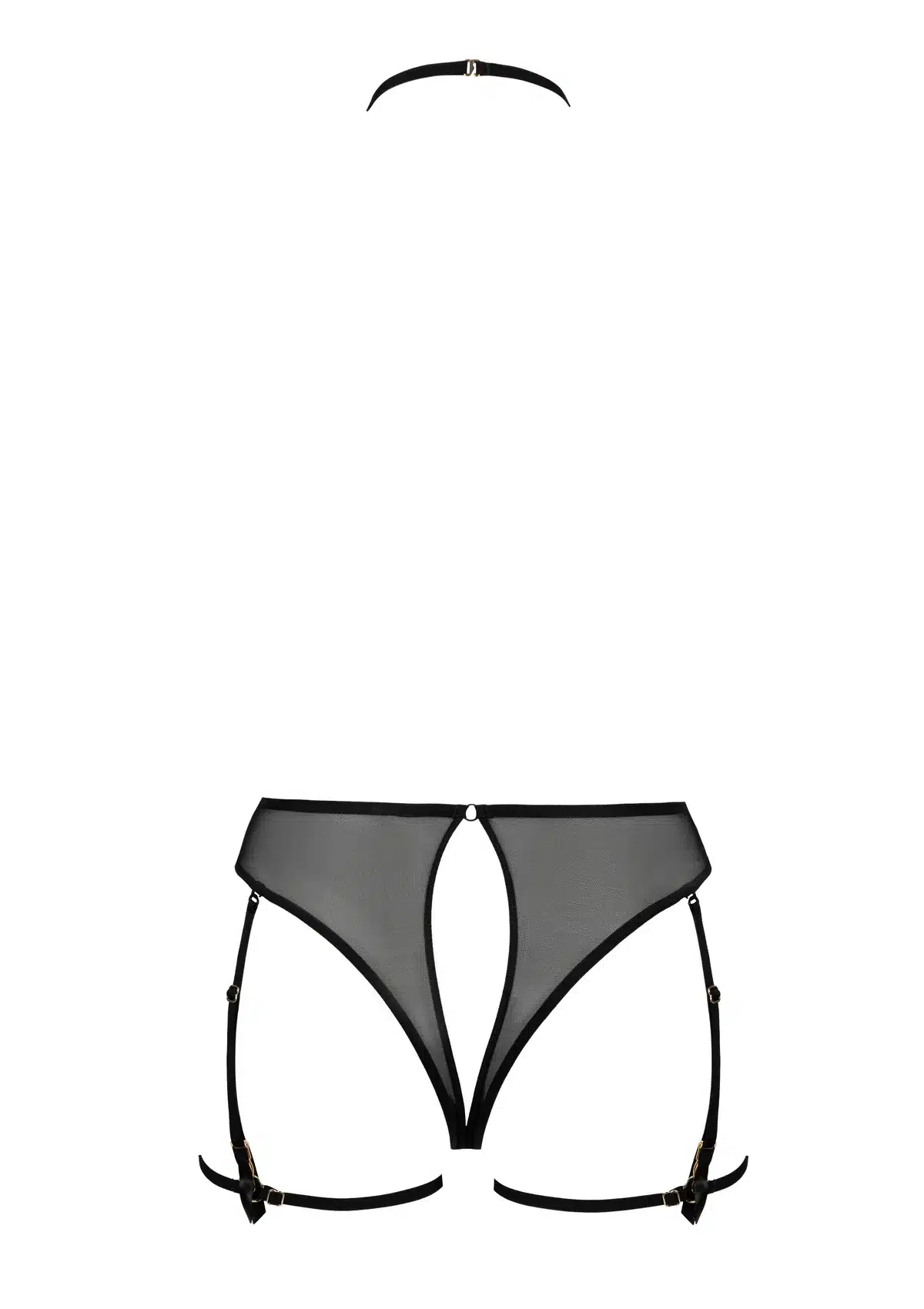 De gespleten achterkant accentueert de rondingen op een speelse en verleidelijke manier, terwijl de verstelbare elastische halsband zorgt voor een perfecte pasvorm en een grafisch harnas-effect. Dit item kan solo worden gedragen als statement lingerie of gecombineerd worden met een bh of top uit de Fleur Défendue-collectie voor een complete en elegante look.