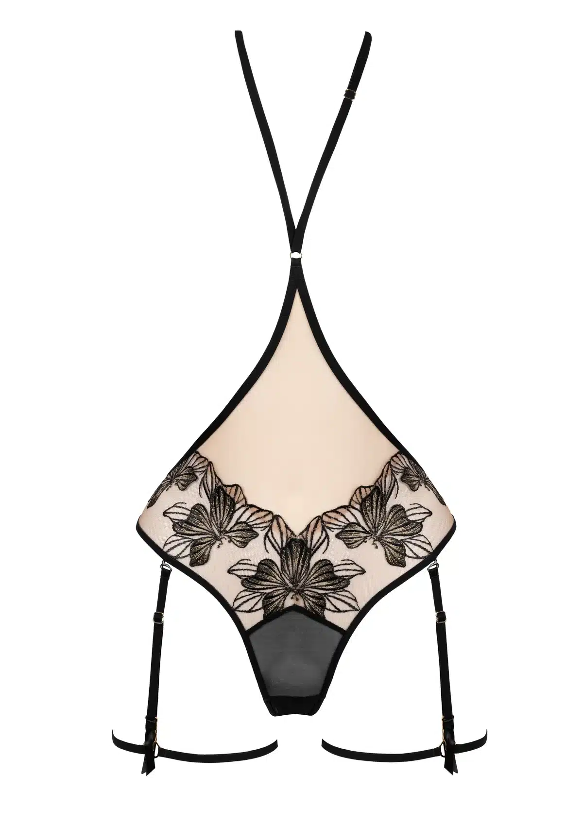 Het Body Harnas Fleur Défendue is ontworpen voor vrouwen die durven te verleiden met zelfvertrouwen. Het harnas omlijst het lichaam met zwart grafisch florale borduursels op een nude achtergrond, subtiel verrijkt met gouden borduurgaren voor een luxueuze glans.