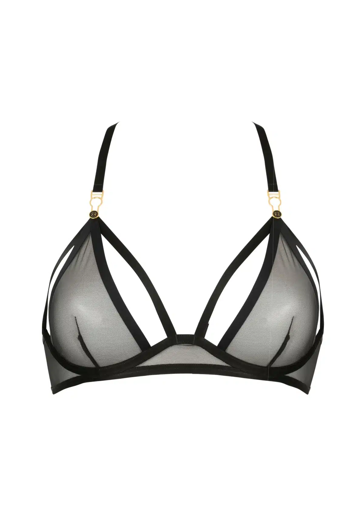 De open cup beugel bh is vervaardigd uit ultrazachte, transparante tule. De cups openen met goudkleurige knopen en juweeldetails, waardoor de borst op speelse en verleidelijke wijze wordt onthuld. De grafische rug en fijne afwerking geven de bh een moderne, luxe uitstraling.