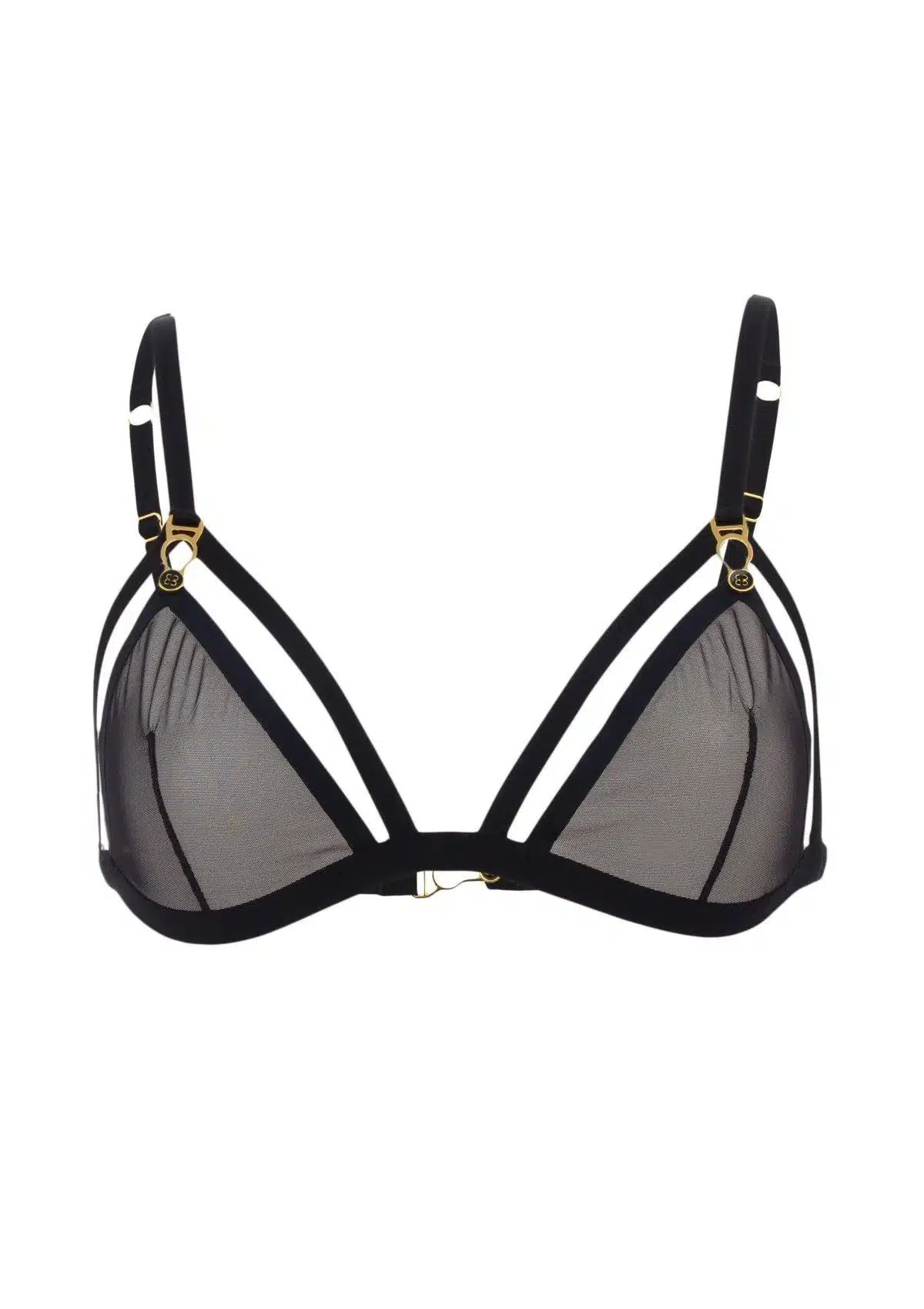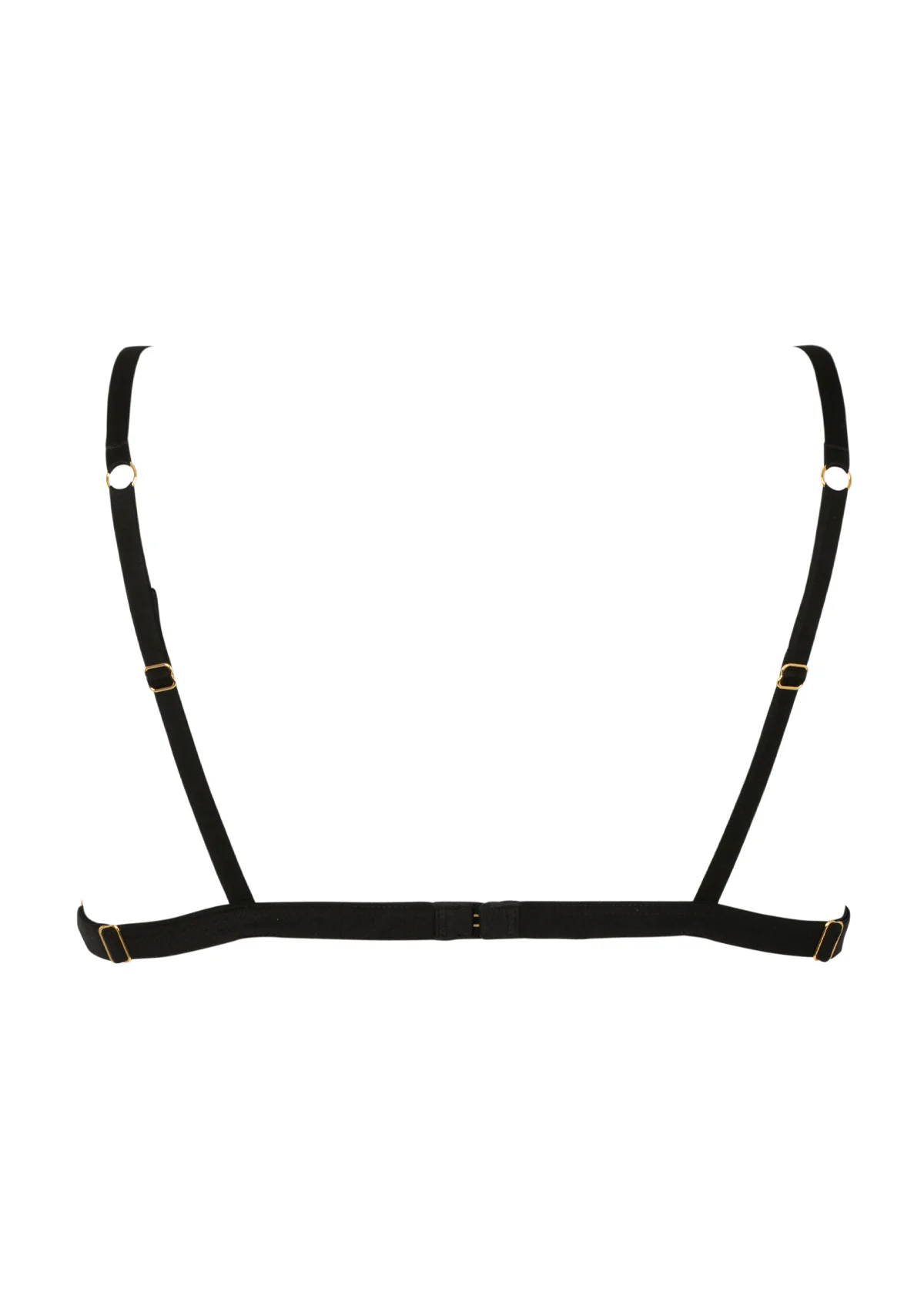 De Insoutenable Légèreté Bralette is vervaardigd uit zachte, transparante tule die licht en comfortabel draagt. De cups kunnen geopend worden dankzij subtiele goudkleurige sluitingen, waardoor de borst elegant wordt onthuld. Het grafische rugontwerp en de fijne elastische bandjes zorgen voor een perfecte pasvorm en een moderne, verleidelijke look.