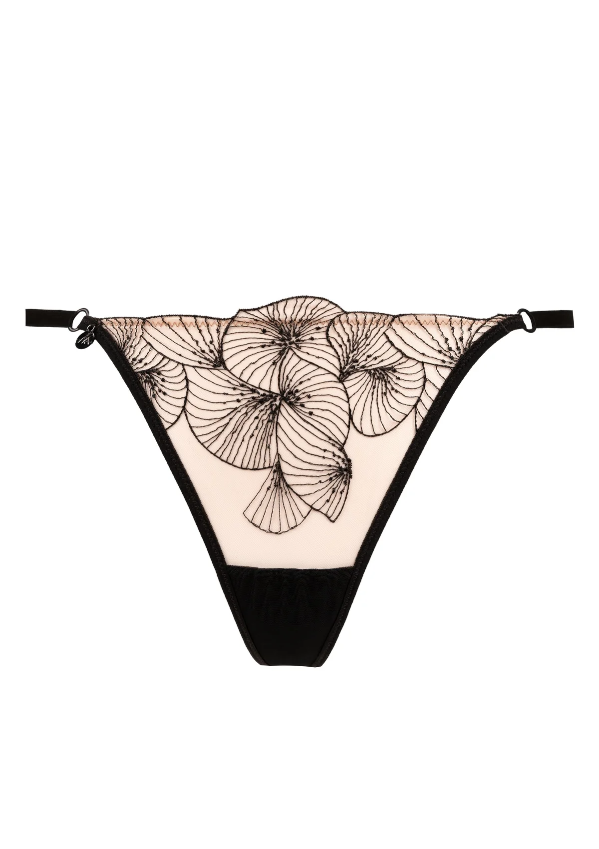 String Menu Plaisir: verfijnde en sensuele string met matching floral broderie. De voorkant is subtiel borduursel op transparant tulle, de zijkanten zijn verstelbaar en het kruis is gevoerd met katoen voor extra comfort.