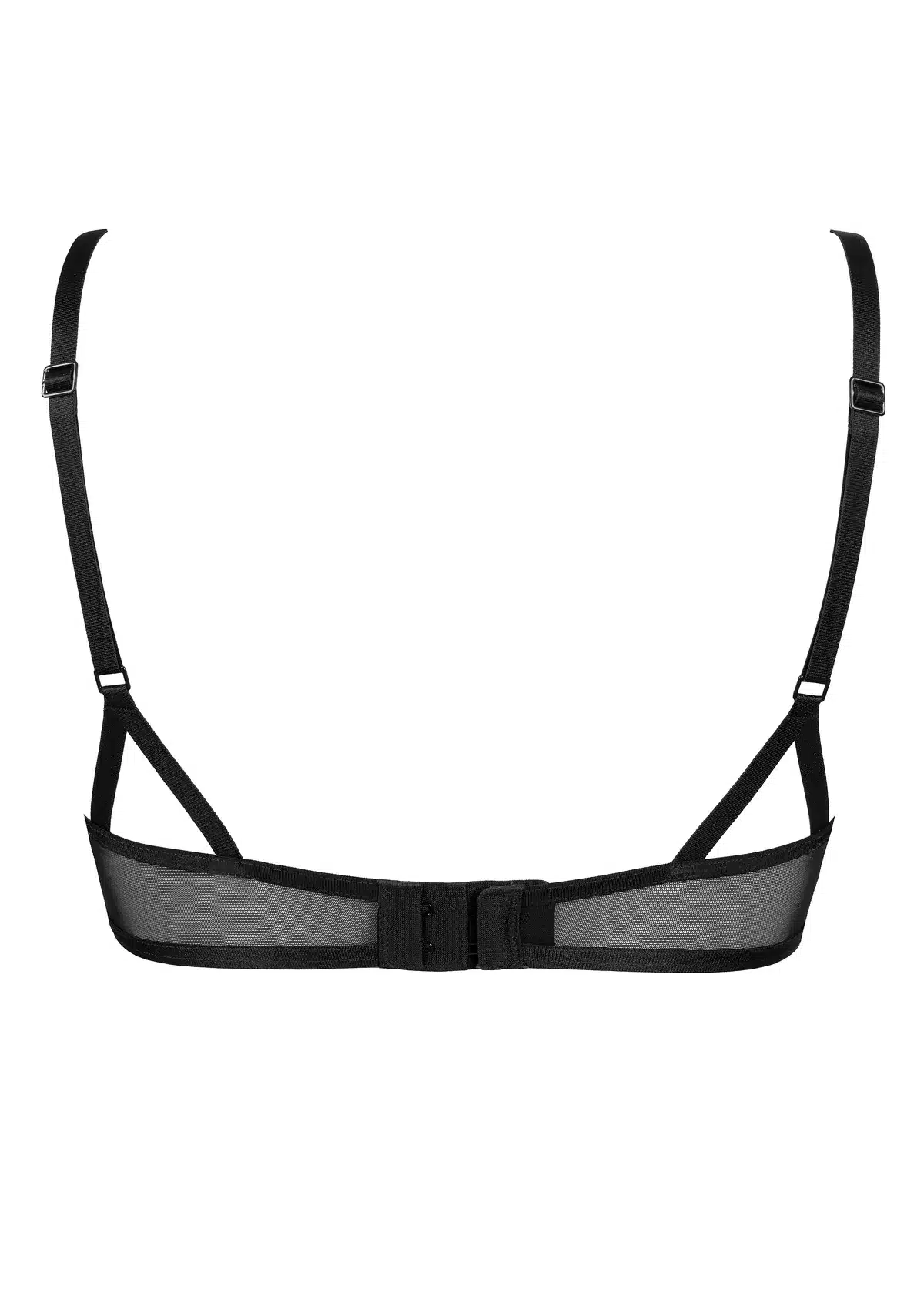 De half cup vorm in combinatie met de onderbeugels creëert een rond en vol decolleté, terwijl de transparante materialen het ontwerp licht en elegant houden. De achterkant is uitgevoerd in zachte tulle voor extra comfort en een verfijnde afwerking.