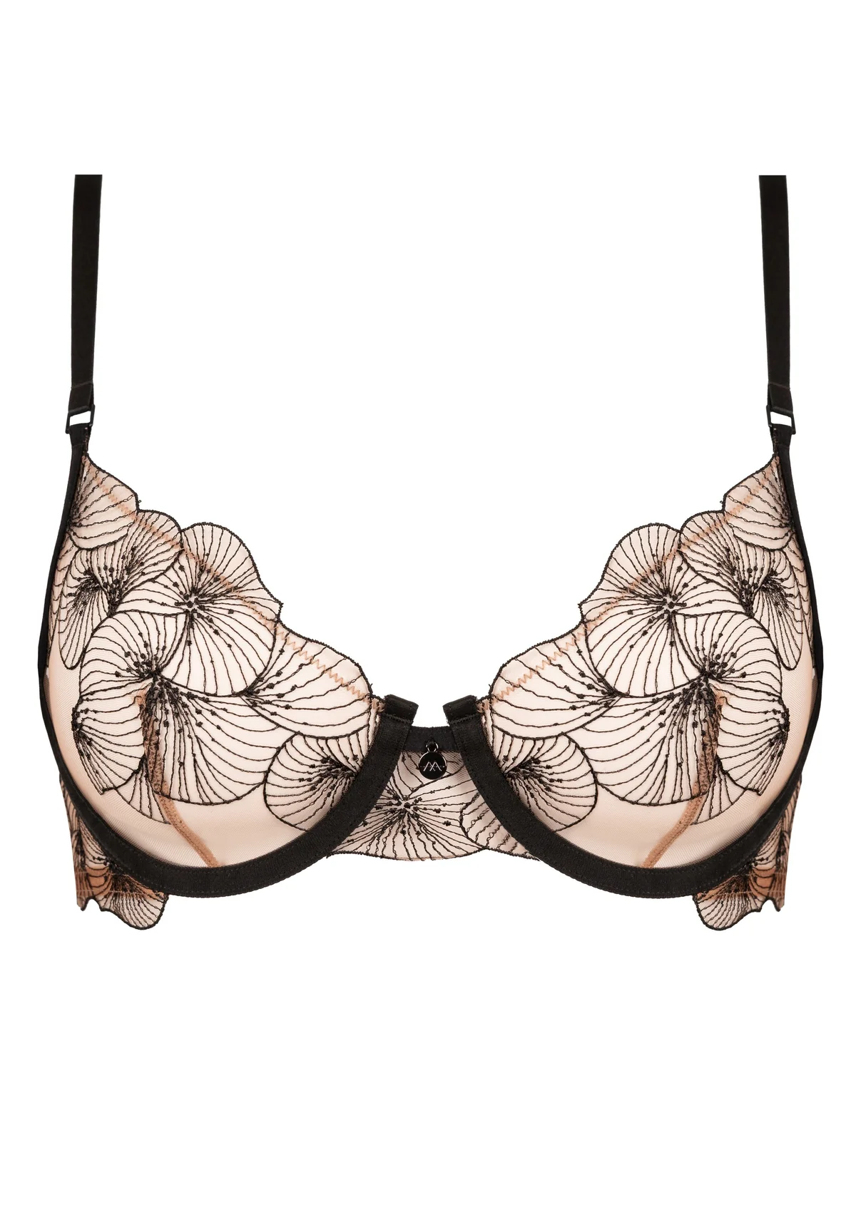 De Half Cup Bh Menu Plaisir is een verfijnde en sensuele bh die speelt met transparantie en grafische lijnen. De cups zijn uitgevoerd in delicate zwarte floral broderie op een nude tulle basis, wat zorgt voor een subtiel “getekend op de huid” effect.