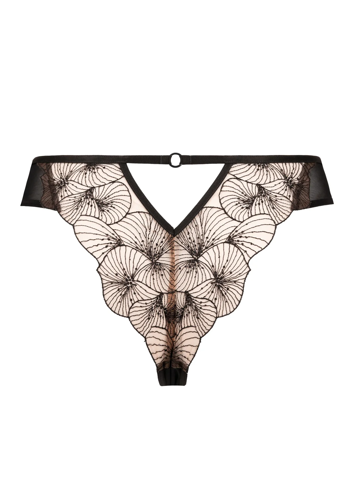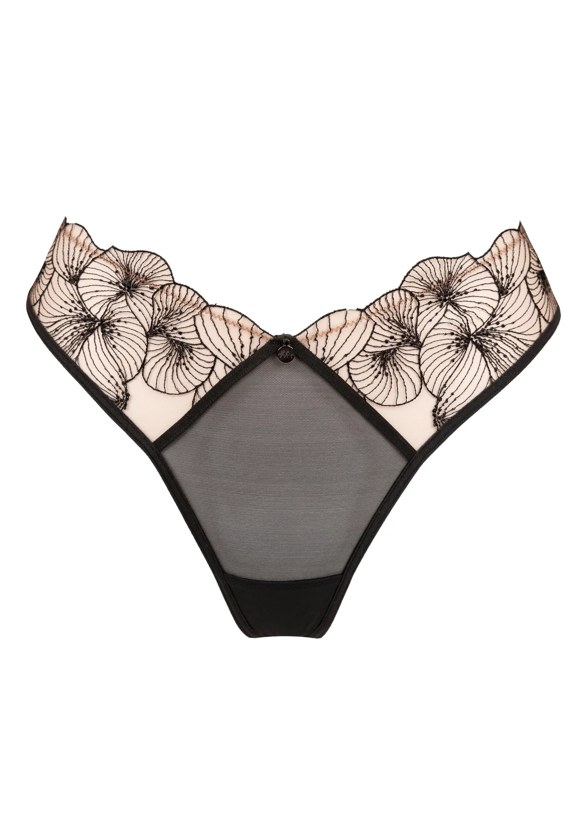 De Tanga Menu Plaisir combineert transparantie en verfijning in een elegant en sensueel ontwerp. De delicate broderie lijkt als het ware op de huid te zijn getekend, wat zorgt voor een subtiel en verleidelijk effect.
