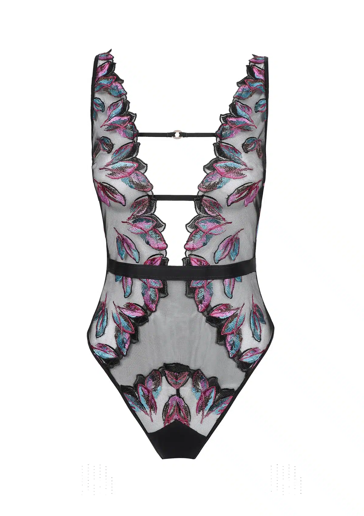 De Body Oiseau de Paradis is een verfijnd statement piece, uitgevoerd in kleurrijke broderie op zacht en rekbaar tulle. Het diepe V-decolleté accentueert de buste op sensuele wijze, terwijl de geborduurde cups zorgen voor een luxueuze uitstraling.