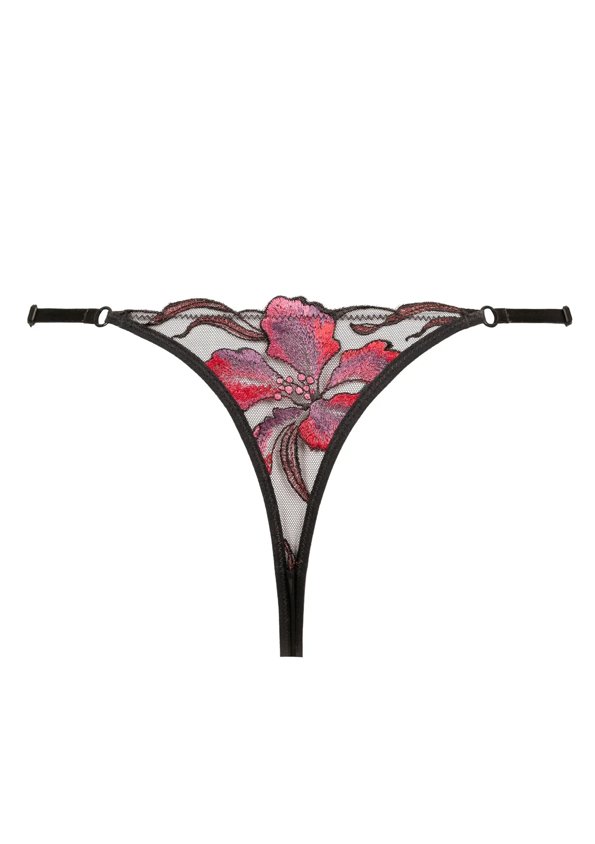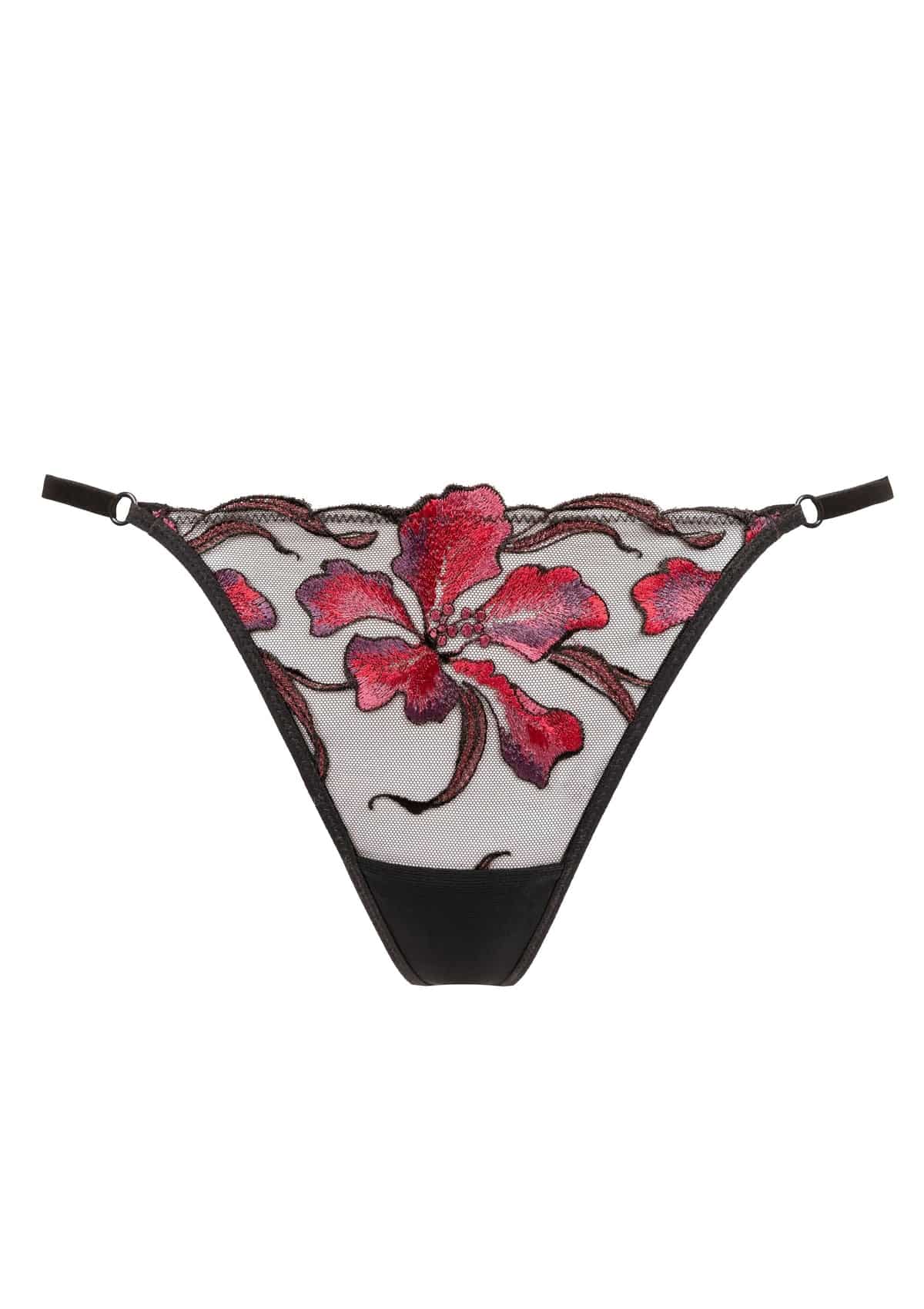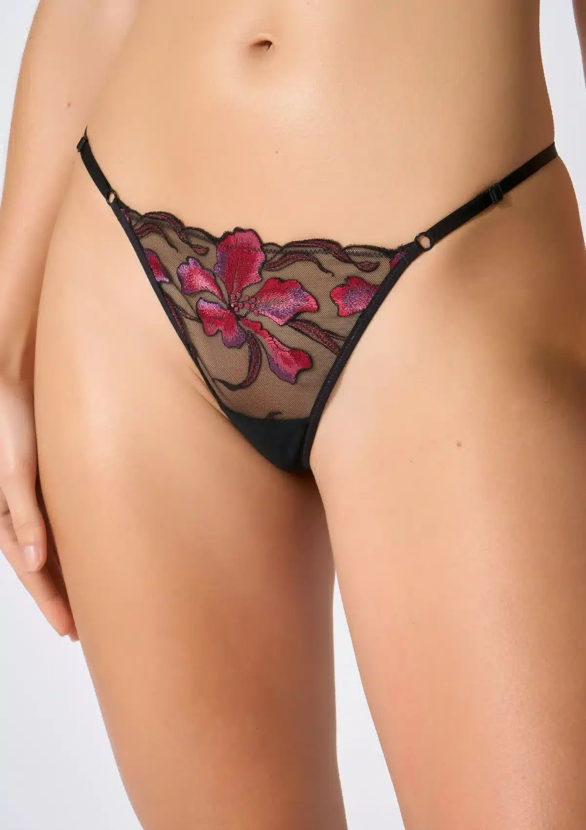 De String Dernier Frisson combineert transparantie en verfijning. De voorkant is voorzien van delicate multicolore floral broderie op fijn zwart tulle, waardoor een luxe en luchtige uitstraling ontstaat.